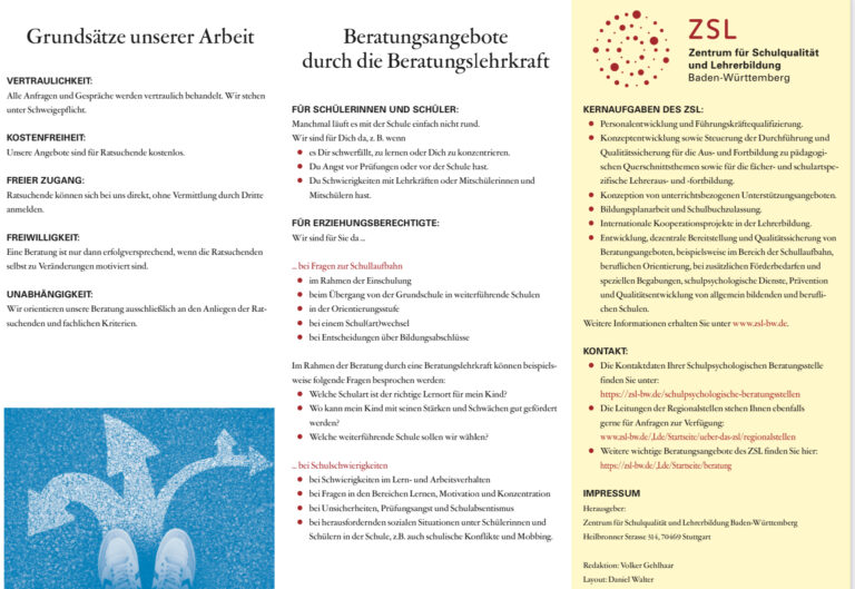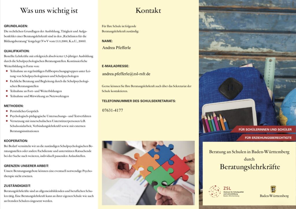 Beratungslehrerin Wann kann man sich an die Beratungslehrerin wenden?SchulleistungsschwierigkeitenSchulangstFragen zur Schullaufbahn (Einschulung, Wiederholung oder Überspringen einer Klasse)problematisches Sozialverhaltenbelastende familiäre SituationUnterstützung bei der Suche nach therapeutischen Angeboten Kontakt:Andrea PfefferleMail: andrea.pfefferle@zsl-rsfr.deTel. 07631/4177 (Name und Telefonnummer hinterlassen)